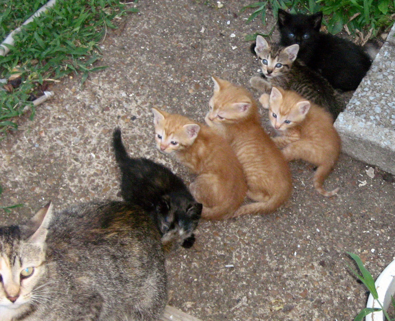 I transfer the clean, dry, sleepy kittens (all conked out immediately after being bathed and then eating) into the “clean” carrier and open the bathroom door. Surprisingly, it’s still light outside; the whole process has taken less than two hours. The mother meows stridently, vexed, as I remove the kittens and put them down next to her (each scampers away to hide under the steps). I am relieved yet somehow more worried than ever. I go back inside, release the frantic dog from the bedroom (she barks furiously at the “clean container” despite the fact that the kittens were in it less than five minutes) and the still wide-eyed grown-up cats from the guestroom.